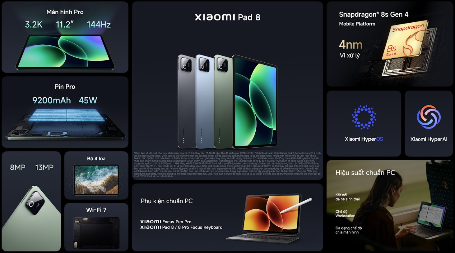 Tiếp đến là bộ đôi máy tính bảng Xiaomi Pad 8 và Pad 8 Pro. Với thông điệp “Hiệu suất toàn năng”, đây không chỉ là một thiết bị giải trí mà còn là một cỗ máy làm việc thực thụ trong thân hình mỏng nhẹ.