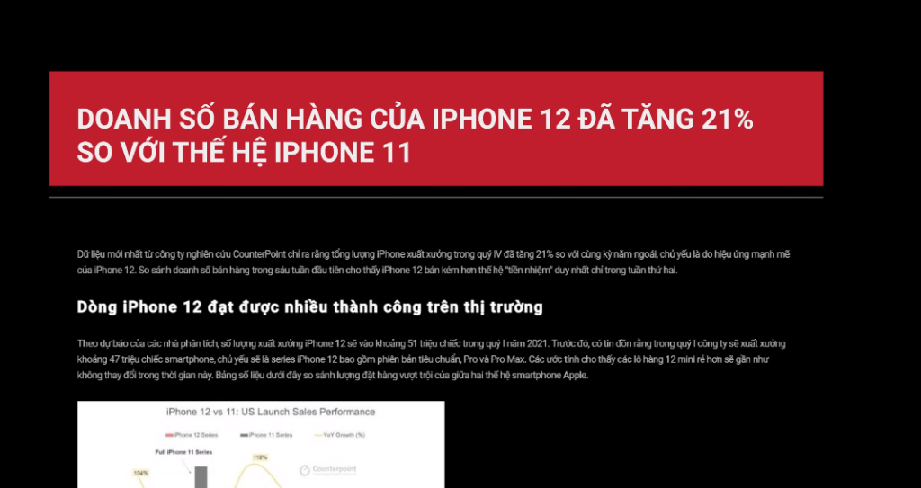 Counterpoint Research cho biết :”Doanh số iPhone 12 vượt mốc 100 triệu chiếc vào tháng 4/2021. Kết quả này đạt được chỉ sau 6 tháng kể từ thời điểm ra mắt. Sớm hơn 2 tháng so với dòng iPhone 11 và gần giống với iPhone 6, thiết bị đã giúp Apple tạo lập siêu chu kỳ đầu tiên”.