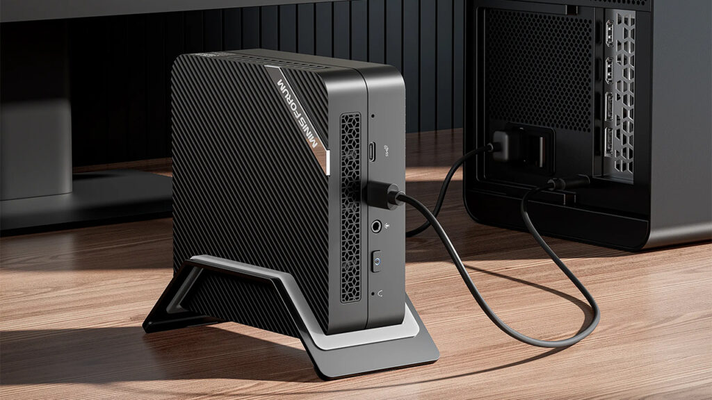 Về khả năng kết nối, UM480XT có một Ethernet 2,5 Gigabit. Hai USB 3.2 Gen 2 Type-A, một USB Type-C chỉ dành cho dữ liệu. Một USB 3.2 Type-C có hỗ trợ DP 1.4, hai USB 2.0 Type-A. Một 3.5 combo giắc âm thanh mm và hai cổng HDMI 2.0. Minisforum đã cố gắng lắp tất cả các cổng này vào một khung máy chỉ rộng 12,76 cm và dày 4,82 cm.