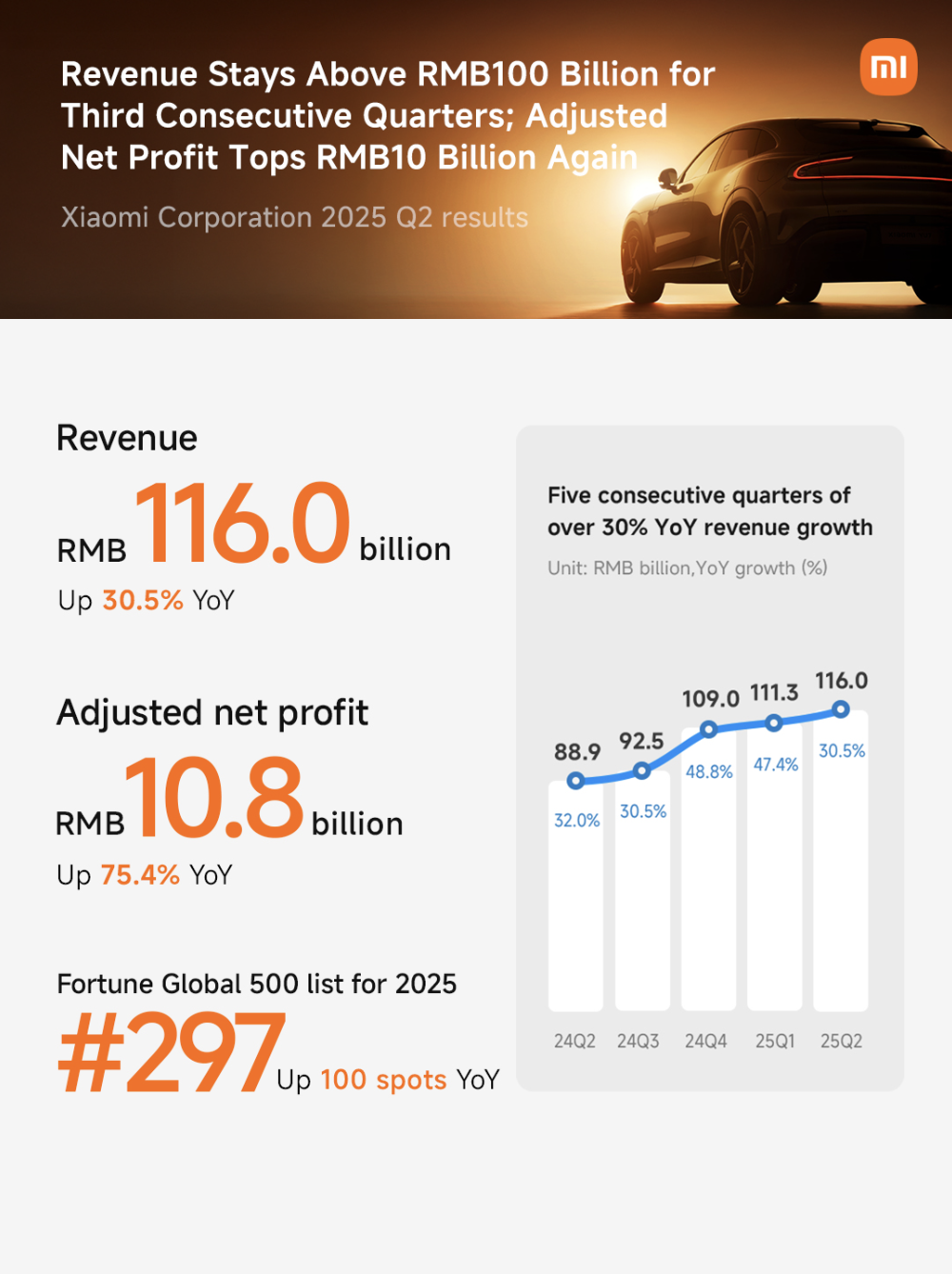 Trong nửa đầu năm 2025, Xiaomi đã giao hơn 157.000 xe, nâng tổng số xe điện bán ra vượt mốc 300.000 chiếc. Đặc biệt, mẫu Xiaomi YU7 Series – SUV hạng sang hiệu năng cao – đã nhận hơn 240.000 đơn đặt cọc chỉ trong vòng 18 giờ sau khi ra mắt.