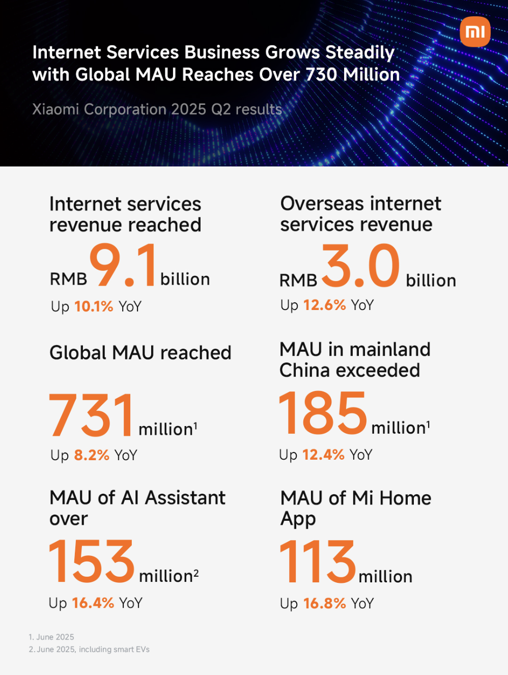 Trong quý II, mảng dịch vụ Internet của Xiaomi đạt 1,274 tỷ USD, tăng 10,1% so với cùng kỳ, với biên lợi nhuận gộp duy trì ở mức cao 75,4%. Lượng người dùng hoạt động hàng tháng (MAU) toàn cầu đạt 731,2 triệu, còn tại Trung Quốc là 184,8 triệu – đều lập kỷ lục mới.