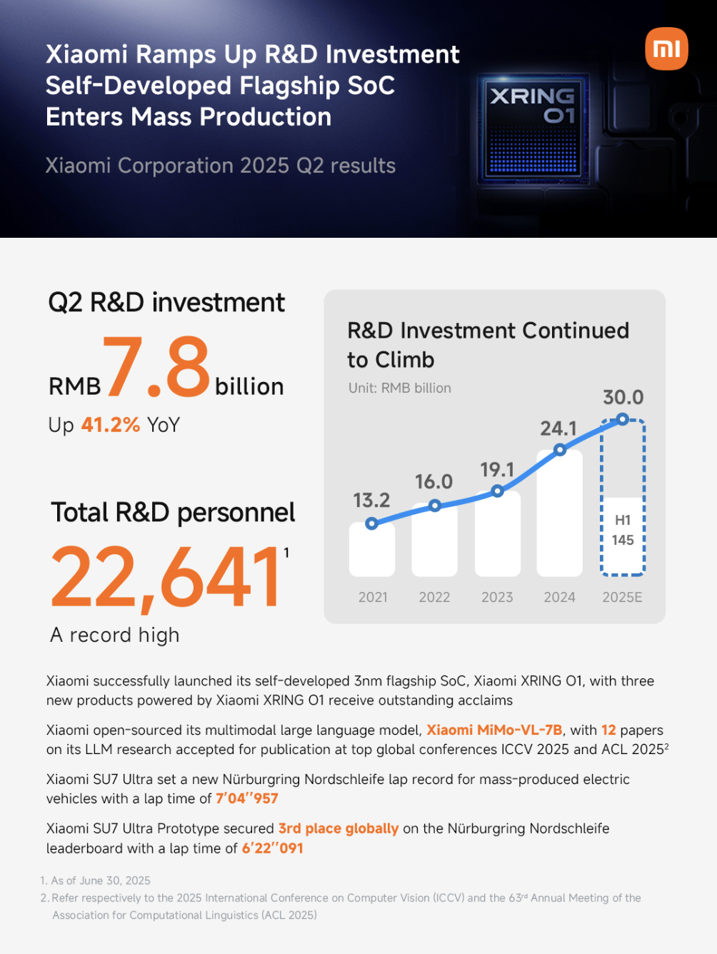 Một dấu mốc quan trọng là việc ra mắt chip 3nm tự phát triển Xiaomi XRING O1, đưa Xiaomi trở thành công ty đầu tiên tại Trung Quốc tự thiết kế chip flagship 3nm. Con chip này đã được trang bị trên Xiaomi 15S Pro và dòng Xiaomi Pad 7 Ultra.